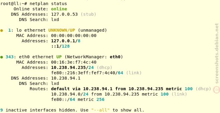 In addition to describing and applying network configuration, the “netplan status” CLI can be used to query relevant data from the underlying network stack(s), such as systemd-networkd, NetworkManager or iproute2, and present them in a unified way.