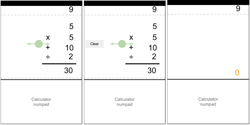 - To clear a calculation user swipes side way and a label (e.g, ‘clear’) transitions in