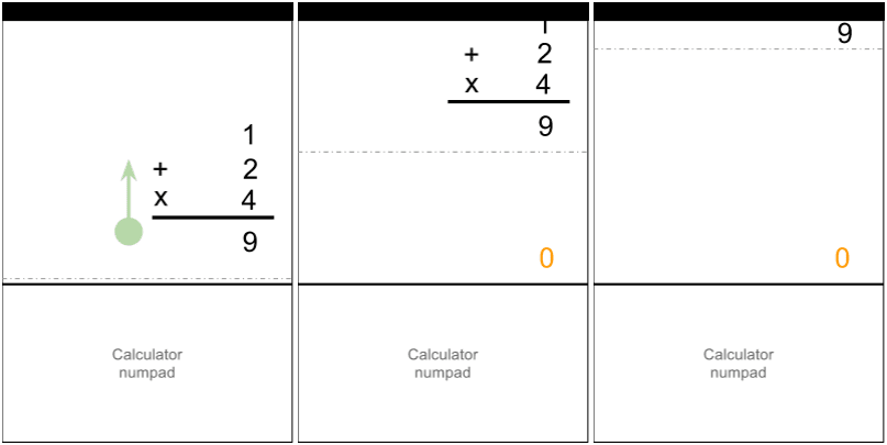 - User enters ‘equals’ on the calculator numpad, and a dash separator line appears with the calculated answer and a line to indicate this calculation could be pulled up to create a new one.