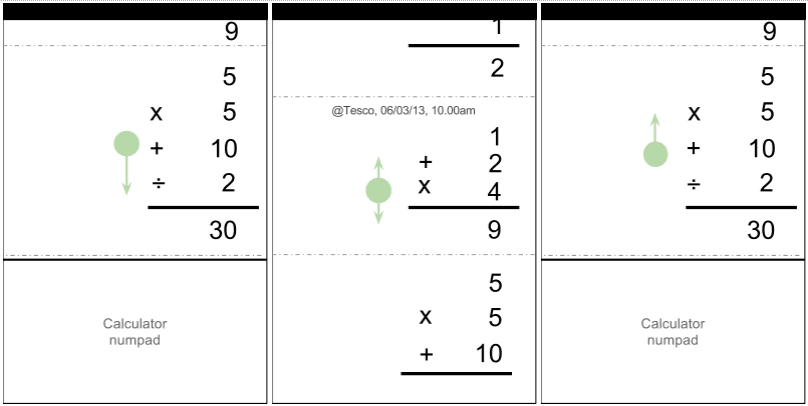 We have also been brainstorming ways to create a new calculation. Our concept was originally inspired by the idea of a receipt tape, which we wanted to follow closely, and an idea that came through the mailing list was that of ‘ripping-off’ a calculation by pulling up; creating a new one (awesome idea, Bruno Girin, thanks!).