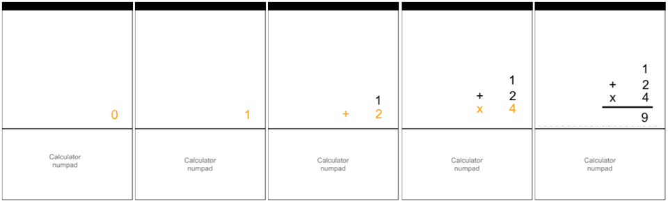 E.g., 1 + 2 x 4, will be read as 2 multiplied by 4, add 1, equals 9.