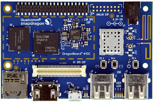 The Dragonboard 410c is the size of a credit card; originally designed to galvanise and inspire IoT developers and innovators by providing a high performance, affordable platform to form the basis of a host of scalable IoT solutions. This ‘democratisation’ of the business of IoT is designed to breathe life into great ‘things’ ideas that otherwise, without the proper funding, or access to technology, may never come to fruition. The ‘c’ in 410c stands for ‘community’ – giving developers the tools to work on prototypes without the cost, and provide a smooth path to commercialization through production ready off-the-shelf or custom system-on-modules based on the Snapdragon 410 processor.