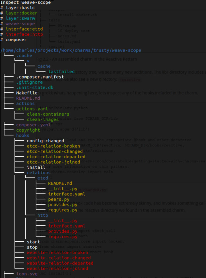 in the directory of the assembled charm, you will be presented with a color coded map of where the files being included came from. This is particulary handy when inspecting a charm to see which layers were included, and how it impacted the overall architecture of the charm.