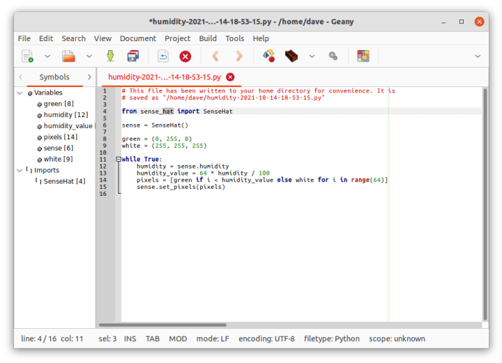 Let’s open up the humidity.py demo script. Go to File > Open example > Simple > humidity.py in the menus. This should fire up your chosen editor with a copy of this script, written to your home directory with a timestamp appended so that you can edit it as much as you’d like. Subsequent selections of that entry will generate a fresh copy of the original: