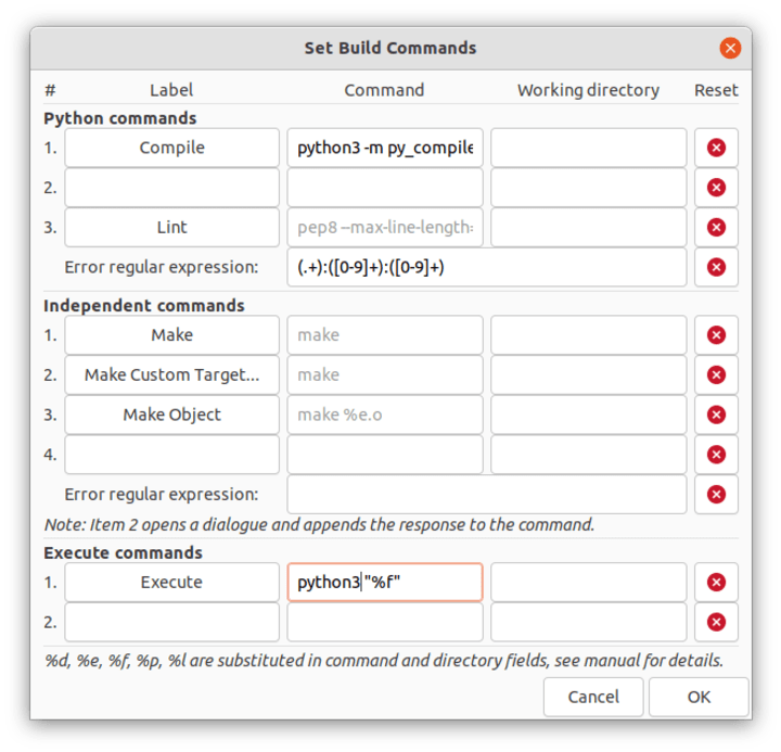If you’re using Geany (as suggested), there’s one more thing we need to do. Geany still defaults to trying to call python rather than python3 when running Python scripts. Since Ubuntu no longer ships Python 2.x, the only interpreter is python3, so we need to tell it to use this instead. Select Build > Set Build Commands from the Geany menu and change the Execute command to python3: