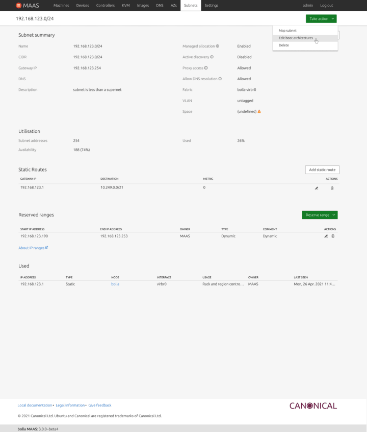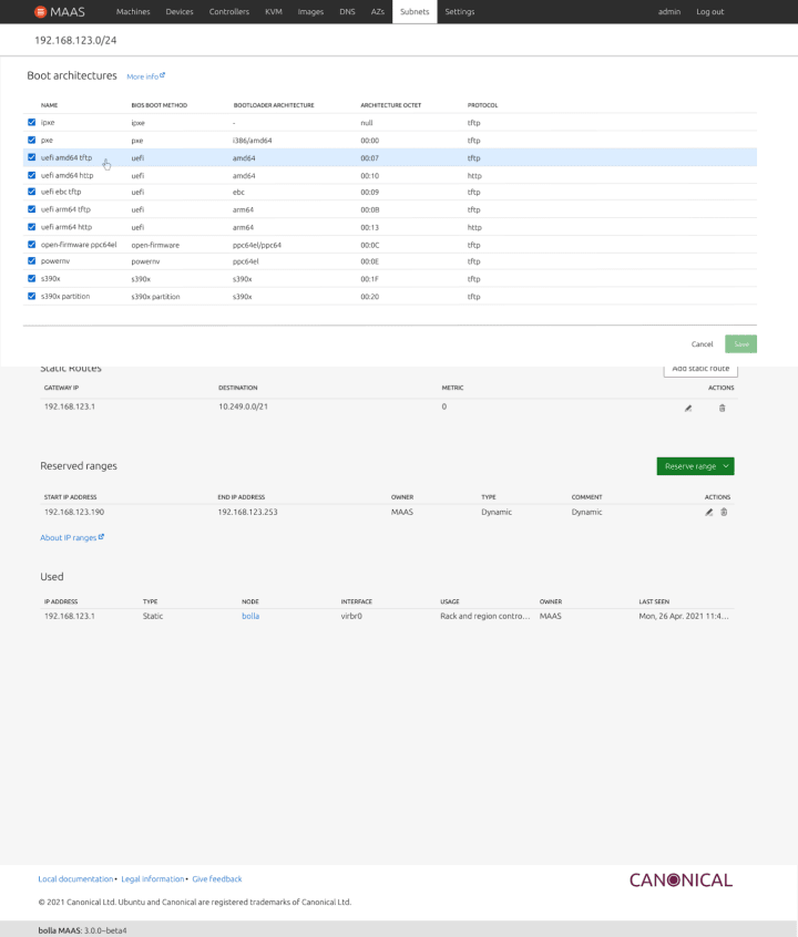 In this design, we’ve added an action in the Subnet details page which will display the form. Giving you the ability to disable boot architectures.