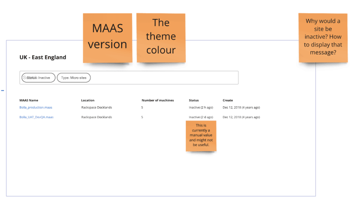 Our earliest and roughest concept design focuses on how to display the right information for region overview. Assuming a user has multiple regions per country, the card below represents different locations in that country and the number of MAAS sites in that location. A user may manually configure the type of MAAS site that exists in that location. For instance, in the card below, there are 2 types of sites; micro-sites (3-10 machines per site) and core sites (25-100 machines for core computation).