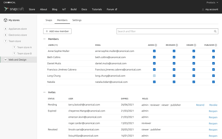 The work for Snapcraft brand store pages continues with the first iteration of building the viewer role pages. This involves removing actions only available to admins as well as access to members, invites and settings pages. There are also UI updates such as adding a filter and icons to the side navigation, as well as changing how the snaps are represented in the main table.