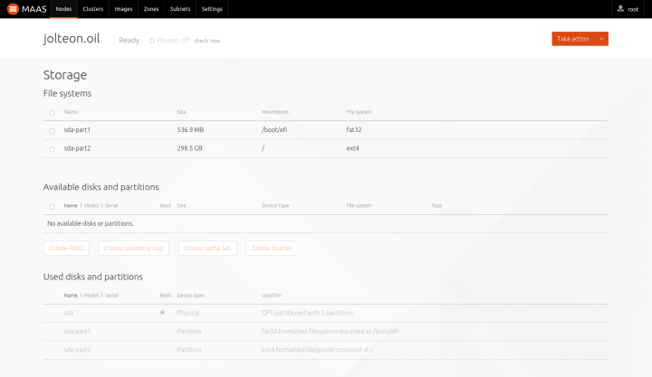 So what’s new with MAAS 1.9? Well, up until release 1.7, MAAS deployed servers with solid, but minimal configuration: each node was left with the boot interface configured, and a single ext4 partition for the root filesystem; a separate boot filesystem was also configured for UEFI-based systems. This meant that any additional networking setup needed to be performed manually, and changing storage configuration was nearly impossible.