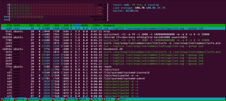 ubuntu@ob76-node0:~$ lxc launch ubuntu:22.04 c-rt -c limits.cpu=2 -c security.privileged=true \