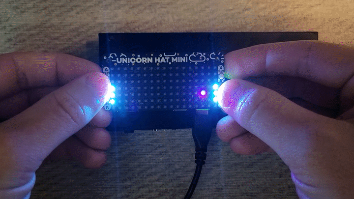 While small, the Unicorn HAT Mini has more pixels than the pHAT so it can display much more. It also has four buttons, making things like simple games possible. This example is a very simple game of Pong that I’ve created. Every time the ball hits a paddle, the color of the ball changes and the game speeds up a little.