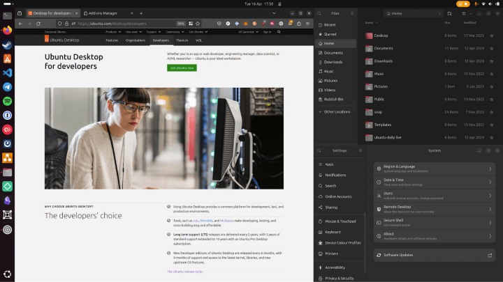 As usual, Ubuntu builds on the excellent foundation provided by GNOME with a number of extensions and additions. The colour picker allows users to tailor their desktop highlights to their taste, triple buffering improves performance on Intel and Raspberry Pi graphics drivers and the addition of the Tiling Assistant extension enables quarter screen tiling support for better workspace management.