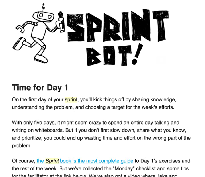 I also watched the official video for the day (which you can get emailed to you by the Sprint Bot the evening before), and read all the comments in the Q&A discussions linked to from the emails. These questions and comments from other people who have run sprints was incredibly useful throughout the week.