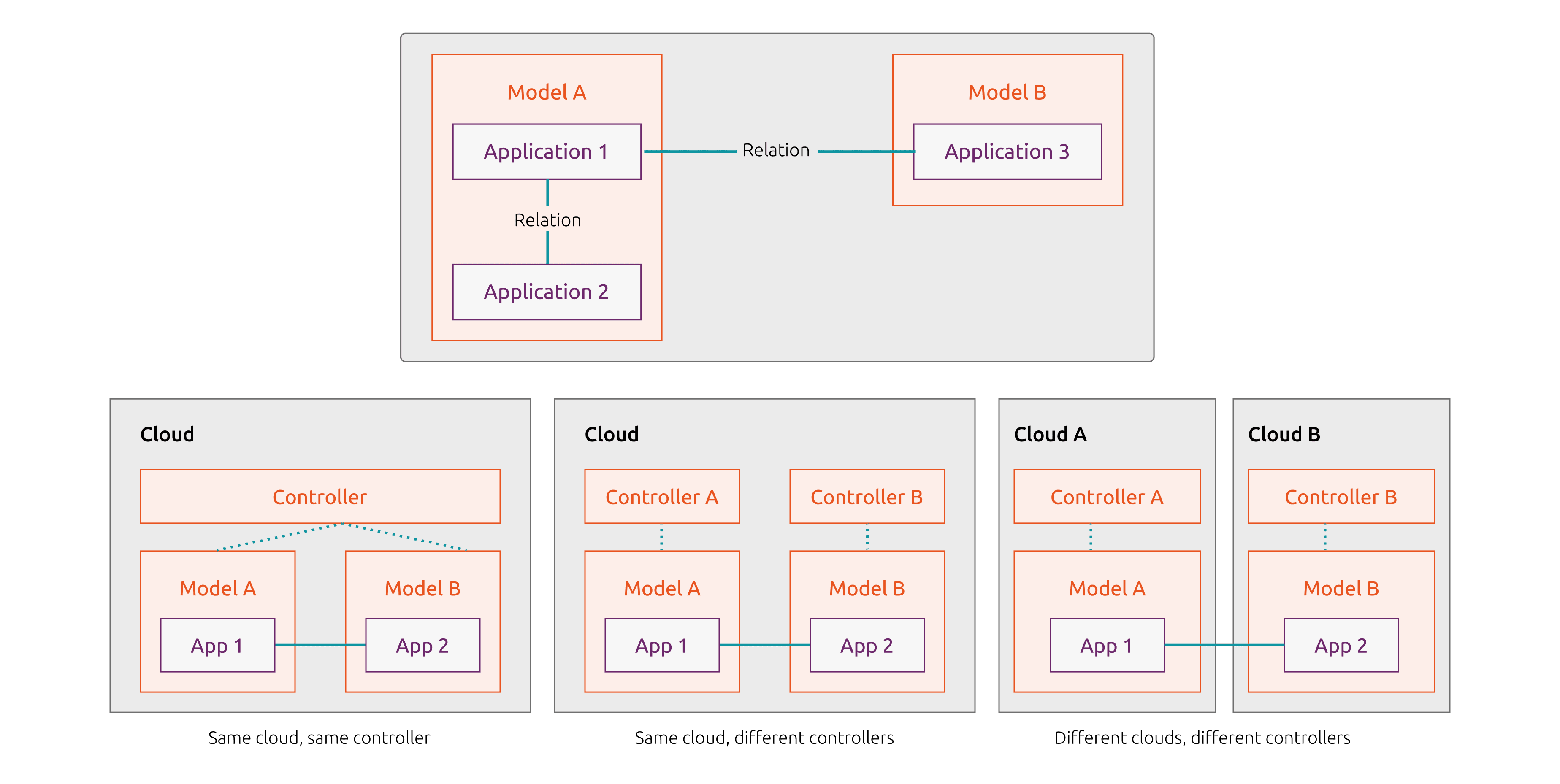 Cross model relations allow applications in different models to be integrated. Models may be hosted on the same controller, different controllers, and different clouds… or even across virtual machines and Kubernetes.